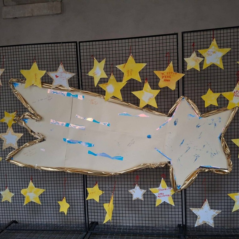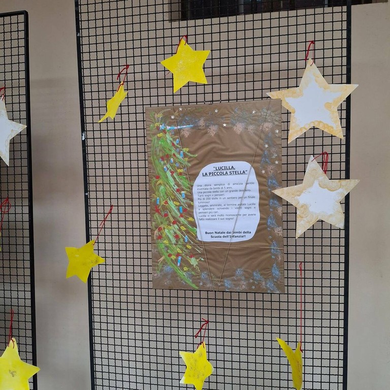 L’idea e i lavori sono nati dopo la lettura di una storia, successivamente illustrata dai bambini: una stella che desidera diventare una cometa luminosa riesce a realizzare il suo sogno grazie alle tante stelle vicine che, donandole i loro pensieri belli e gentili, la rendono sempre più felice e brillante, fino a quando le spunta la coda, che si allunga e illumina sempre di più. “Lucilla era diventata una cometa di Natale felicissima e splendente! …brillava così tanto perché era piena di pensieri belli e gentili”.