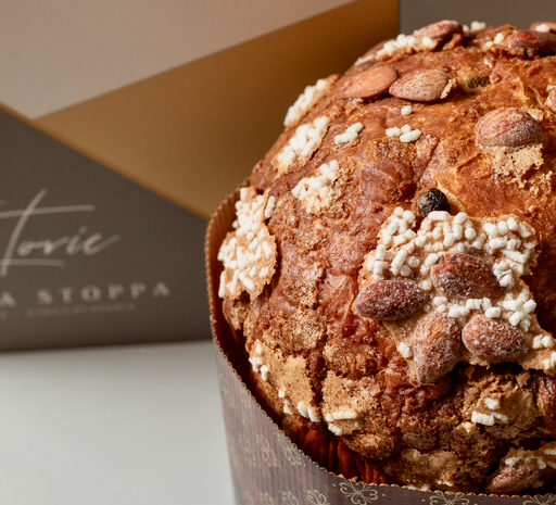 Il panettone classico, alla Pasticceria Storie di Cuneo, nasce come il risultato di progetto che Mattia Stoppa, titolare e pasticciere, interpreta come esercizio di coerenza artigianale, lontano da logiche di volume o di calendario. Il lavoro parte da una filiera controllata, con burro italiano a prevalenza piemontese e uova fresche da allevamento a terra, selezionate in funzione del dolce stesso. La componente aromatica è affidata esclusivamente a ingredienti naturali, senza scorciatoie o additivi, in un equilibrio studiato e riconoscibile. Il lievito madre detta tempi e svolgimento della preparazione, imponendo una produzione lenta che si sviluppa nell’arco di più giorni e scandisce ogni fase della lavorazione. Centrale è l’uso dell’impastatrice a braccia tuffanti, scelta tecnica che imprime struttura, stabilità ed elasticità dell’impasto. La lavorazione procede per passaggi distinti, nel rispetto rigoroso di riposi, temperature e fermentazioni controllate. La frutta entra solo nella fase finale, per preservarne integrità e distribuire correttamente il carico zuccherino. La glassatura alle mandorle definisce un profilo classico, misurato e immediatamente riconoscibile. Dopo la cottura, il raffreddamento capovolto tutela la morbidezza interna e la tenuta della cupola. Ne nasce un panettone “milanese” volutamente lontano da standard industriali e da conservabilità estese. Un dolce dunque vivo, umido, piacevole al palato, il cui risultato complessivo è una fetta connotata da un buon equilibrio tra i diversi ingredienti.