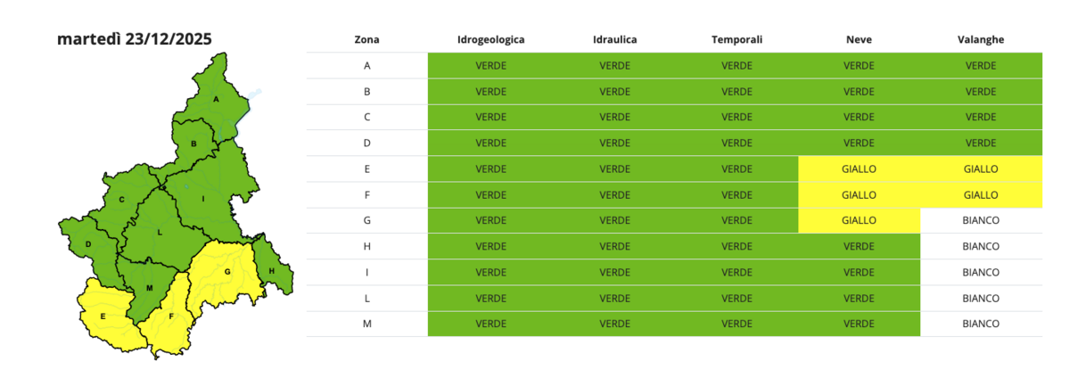 E' l'aggiornamento di Arpa Piemonte per la giornata di domani 23 dicembre.