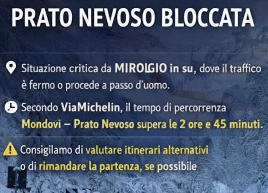 Sarà consentito procedere verso Prato Nevoso e Artesina esclusivamente in presenza di deflusso da monte, al fine di evitare congestioni e garantire condizioni di sicurezza per gli utenti della strada.