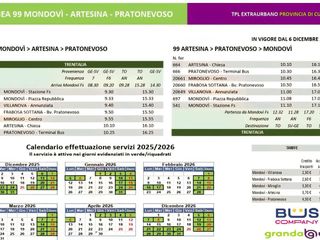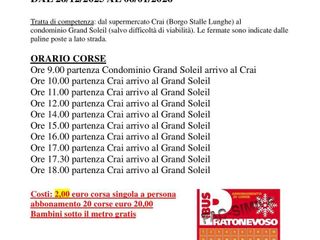Ricordiamo infine che è attivo, tutti i giorni fino al 6 gennaio, il servizio di linea autobus del Consorzio Grandabus, i cui orari e fermate possono essere verificati al sito www.moeves.it.