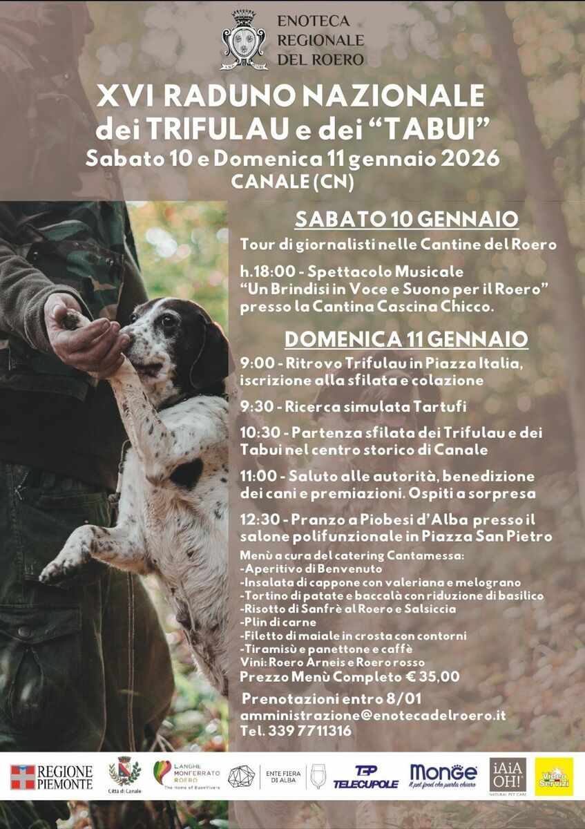 Tutto pronto a Canale per la sedicesima edizione del Raduno Nazionale dei Trifulau e dei “Tabui”, appuntamento promosso dall’Enoteca Regionale del Roero, evento unico nel suo genere che celebra i veri protagonisti della ricerca del prezioso tartufo: i cani da tartufo e i loro instancabili cavatori, i trifulau.