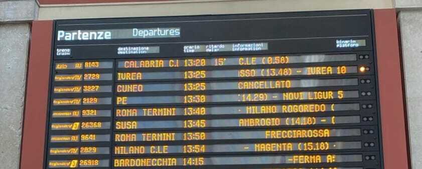 [Il tabellone con gli orari nella stazione di Torino Porta Nuova che riporta la cancellazione del treno per Cuneo]