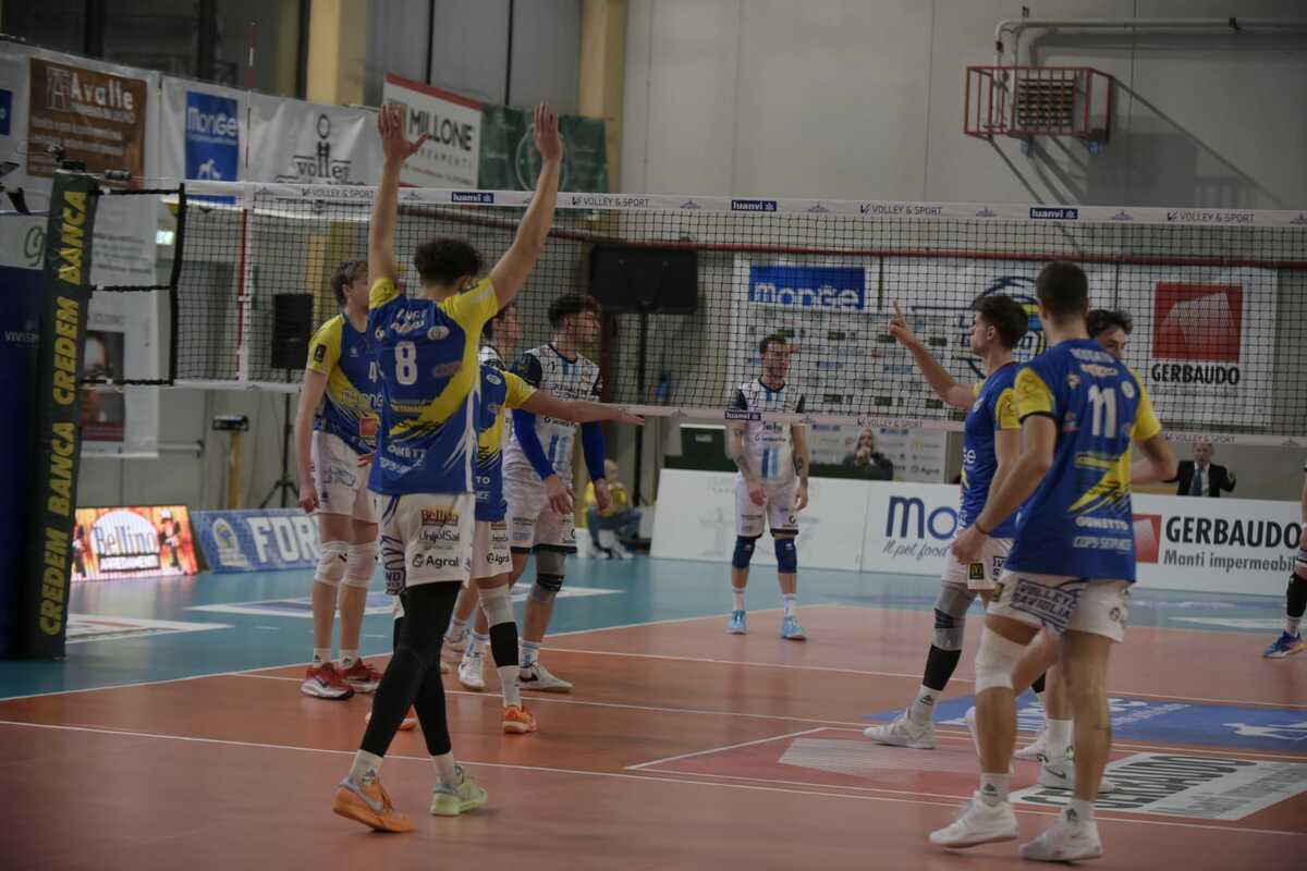 Dal secondo set, però, è tutta un’altra storia, perché il Monge-Gerbaudo entra con un altro piglio, trova continuità in attacco soprattutto con Schiro e, elemento decisivo a conti fatti, commette meno errori gratuiti. Ne nascono due set vinti con merito dai piemontesi, che nel terzo ritrovano anche un Rossato più sicuro sui palloni importanti. Il quarto è un lungo tira e molla, con le due squadre che sembrano avere la “sindrome da braccetto” quando la fuga sembra vicina. Lo strappo decisivo è dei piemontesi, che recuperano dal -3 (16-19) e s’impongono 25-21, con il punto finale messo a referto proprio da Rossato.