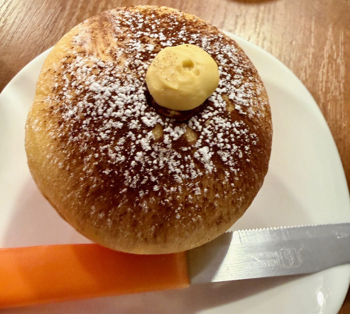 La brioche allo zabaglione ci ha francamente lasciati perplessi: l’idea evocata da quest’ultimo richiama qualcosa di liquido, laddove invece il ripieno della brioche risulta solido e, in ultimo, non in linea con la cifra estremamente più “aerea” di altre creazioni. Il dubbio che mi è rimasto, visto che nella tarda mattinata della Befana non erano (più) disponibili le versioni salate, è che questo formato della brioche si adatti meglio a queste ultime.