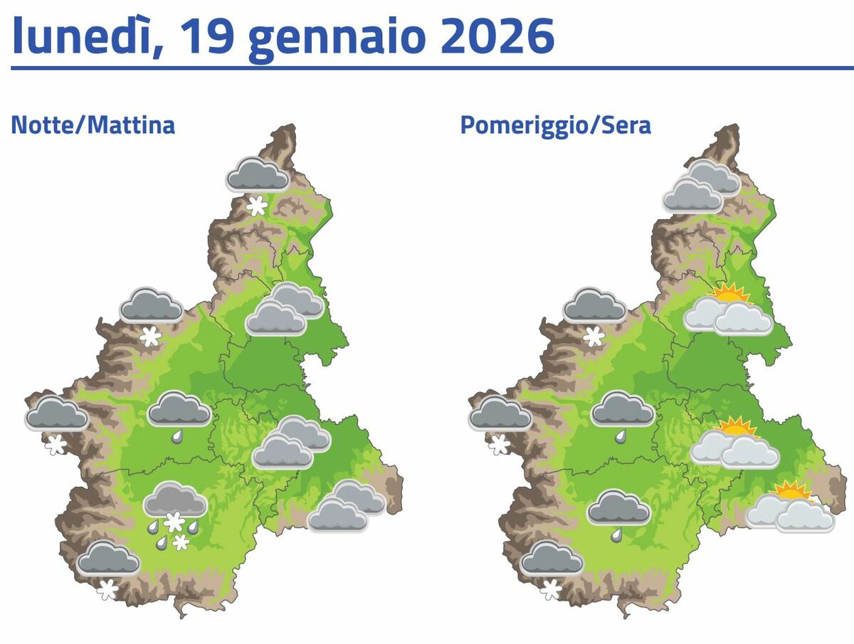 Le precipitazioni, deboli e a tratti intermittenti, interesseranno l'intero territorio piemontese, risultando più sporadiche solo sull'Alessandrino. Lo zero termico scenderà progressivamente fino a 900-1000 metri nelle zone meridionali e 1200-1300 metri nel resto della regione.