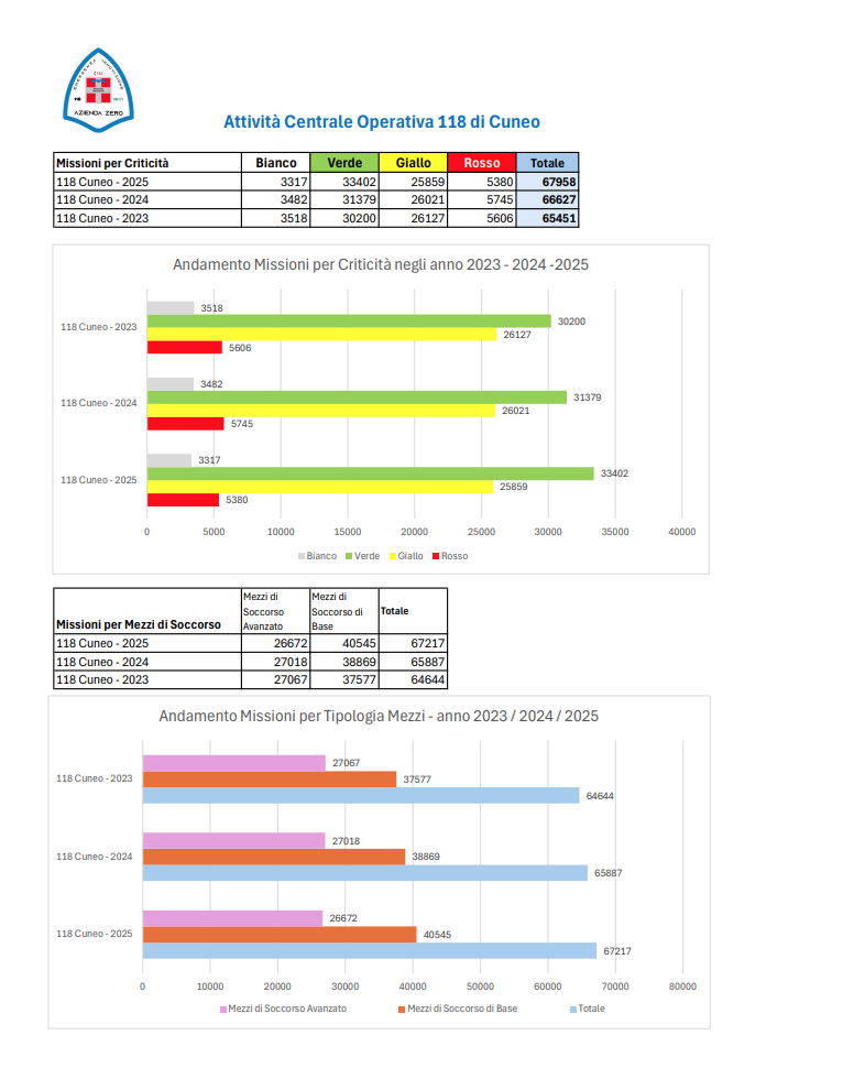 Diretta dal 1° gennaio da Giovanni Marraccini, la Centrale Operativa 118 di Cuneo ha visto questo andamento della gravità delle missioni negli ultimi tre anni: i codici rossi sono passati dai 5.606 del 2023 ai 5.380 del 2025, i gialli da 26.127 a 25.859, i verdi da 30.200 a 33.402 e i bianchi da 3.518 a 3.317.