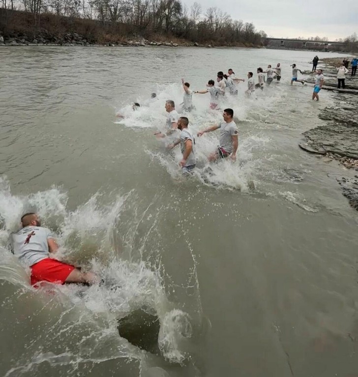 Subito dopo, come da tradizione, si è svolto il lancio della croce nelle acque gelide del Tanaro: un gesto simbolico che rappresenta la purificazione e il rinnovamento. A seguire, il tuffo di 31 ragazzi, che hanno sfidato freddo e corrente per recuperarla, in un passaggio che unisce devozione e coraggio.