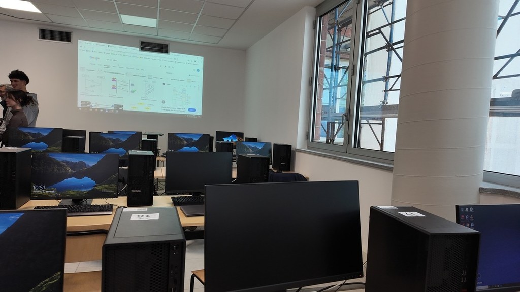 Salendo di piano ancora la biblioteca, un’aula incontri e di sviluppo della realtà aumentata e virtuale. All'ultimo piano l’aula di disegno e il laboratorio Turing.
