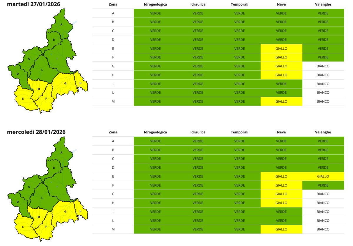 "Sono attese nevicate a quote collinari sul basso Piemonte e a quote di pianura tra Cuneese e Langhe – si aggiunge –. Graduale innalzamento della quota neve nel corso della mattina e miglioramento del tempo dal pomeriggio di domani, mercoledì 28".