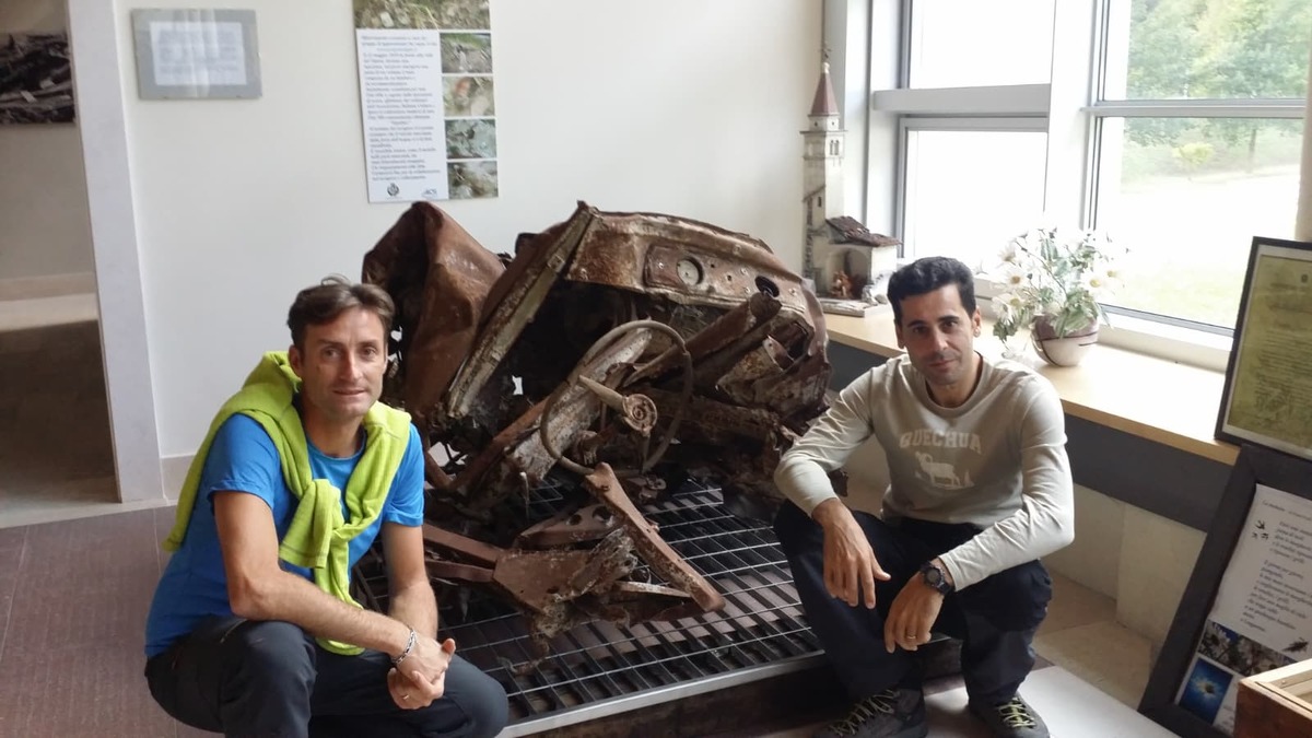[Enrico Vicini e Marco Tucci con la carcassa dell'automobile recuperata]