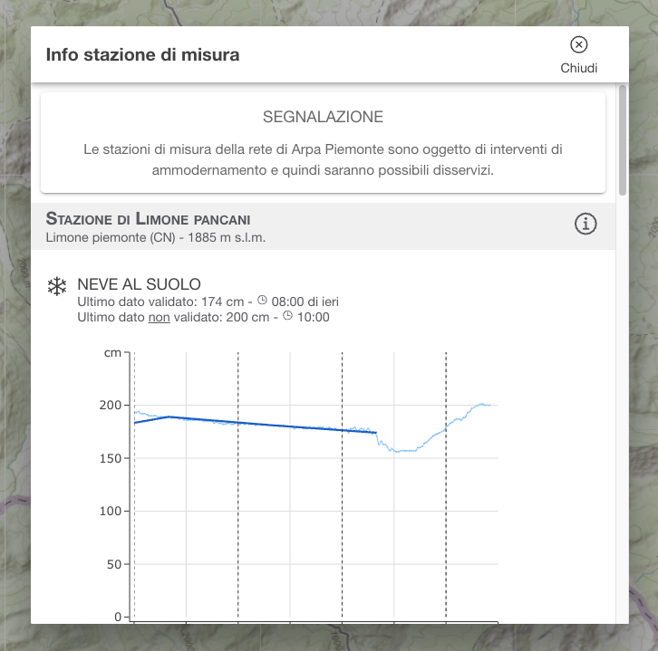 Sempre in Val Vermenagna, la stazione di Palanfrè, piccola borgata nel comune di Vernante, ha registrato in mattinata 170cm di neve al suolo, situazione simile in Valle Stura, ad Argentera (125 centimetri).