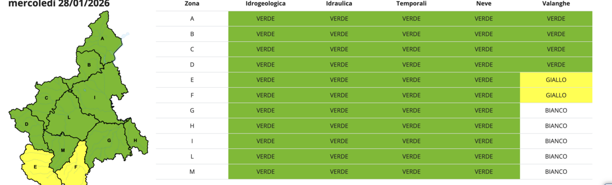 Per la giornata di oggi, mercoledì 28 gennaio, l'Arpa Piemonte ha diramato allerta gialla per valanghe nel Cuneese (in particolare Val Tanaro, Valli Varaita, Maira e Stura). Nel pomeriggio sono previste deboli precipitazioni residue sul Piemonte nord-orientale, con quota neve a circa 800-1000 m; sul resto della regione si apriranno schiarite a partire da sud-ovest. Domani mattina formazione di locali nebbie e possibili gelate in pianura e sulle zone collinari, specie nelle zone con neve al suolo e laddove il cielo si manterrà sereno.