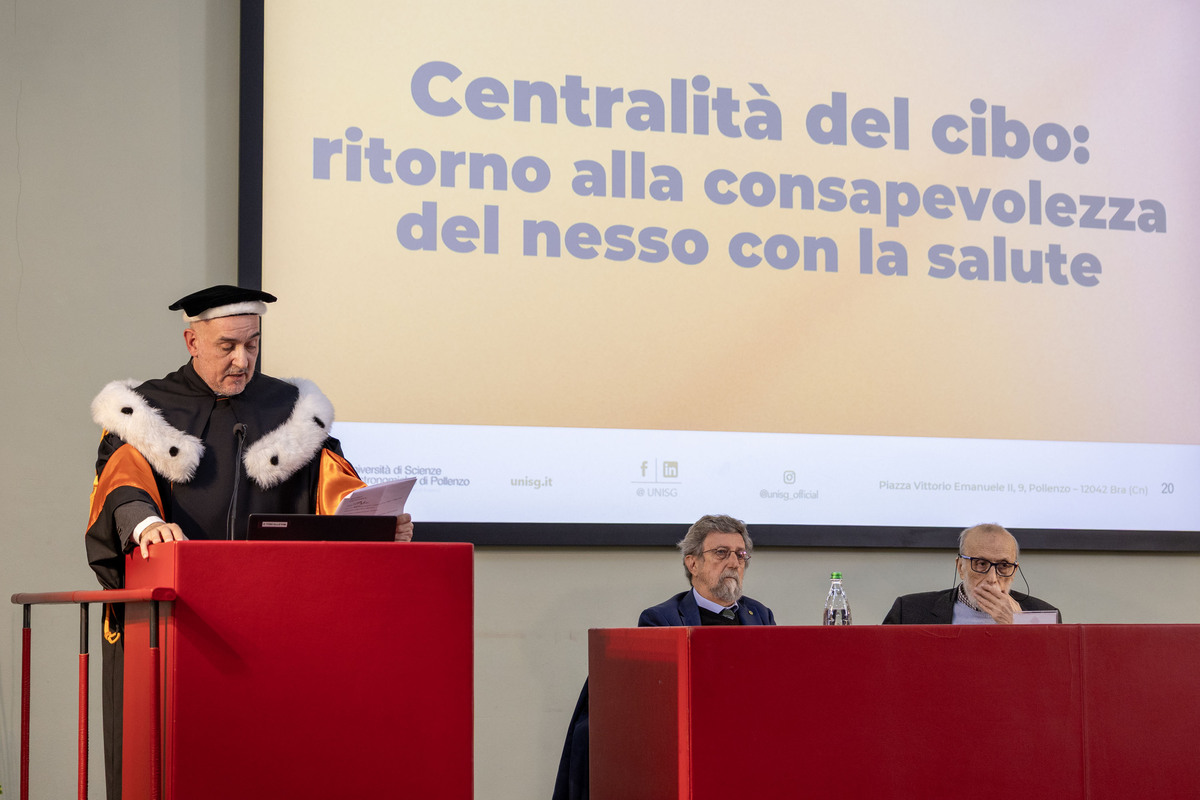 Ha poi affermato: “La relazione del professor Vineis ha messo in luce il tema della biodiversità, ricordandoci che tutto è connesso. Noi a Pollenzo abbiamo dato senso a quanto già aveva intuito Brillat-Savarin, padre della gastronomia moderna occidentale, valorizzando le discipline connesse alla gastronomia. Su questo percorso siamo nati e vi abbiamo dedicato 22 anni di lavoro. Il cibo deve passare da una dimensione semplicemente multidisciplinare a una dimensione centrale. Il cibo è la nostra vita, e concepirlo come centrale richiede consapevolezza. E in riferimento alla bellissima relazione delle due rappresentanti degli studenti, che hanno proposto considerazioni e idee piene di sentimento e di positività, voglio ricordare che il gastronomo del futuro deve essere anche un soggetto politico”.