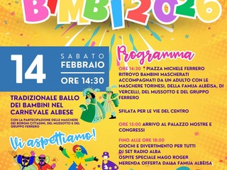 Il momento culminante del Carnevale albese 2026 sarà senza dubbio il Ballo dei Bambini, in programma sabato 14 febbraio a partire dalle ore 14.30. I piccoli partecipanti, rigorosamente mascherati e accompagnati da un adulto, sfileranno per le vie del centro cittadino fino a raggiungere il Palazzo Mostre e Congressi di Alba.