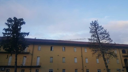 Maestoso, altissimo… e totalmente secco. Perciò si prospetta l’abbattimento, come già avvenuto per altri due esemplari che svettavano nella stessa area.