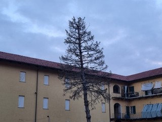 Maestoso, altissimo… e totalmente secco. Perciò si prospetta l’abbattimento, come già avvenuto per altri due esemplari che svettavano nella stessa area.