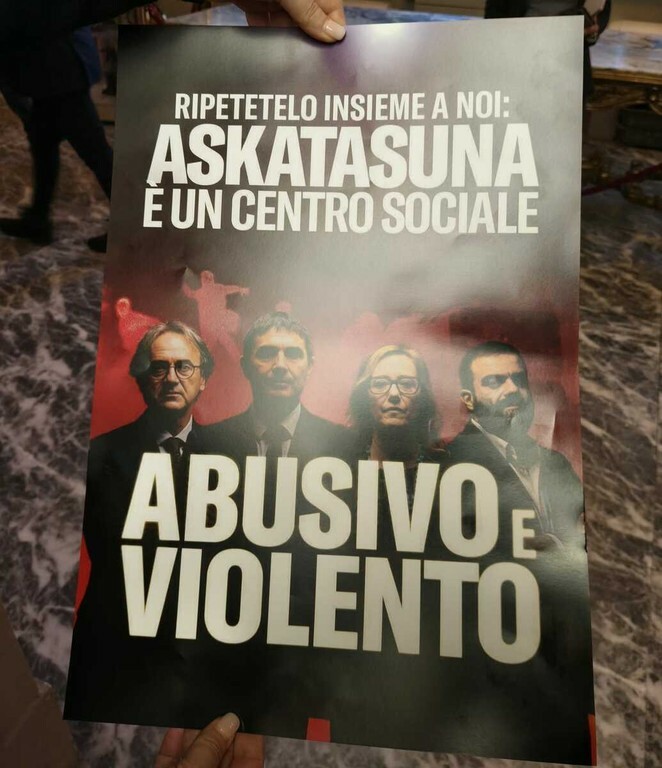 Il dibattito si era già aperta con una protesta di Fratelli d'Italia. I consiglieri hanno hanno sventolato un manifesto con il viso degli esponenti europei e nazionali di AVS Angelo Bonelli, Nicola Fratoianni, Ilaria Cucchi e Marco Grimaldi. Sopra la scritta: "Ripetilo insieme a noi, Askatasuna è un centro sociale abusivo e violento".