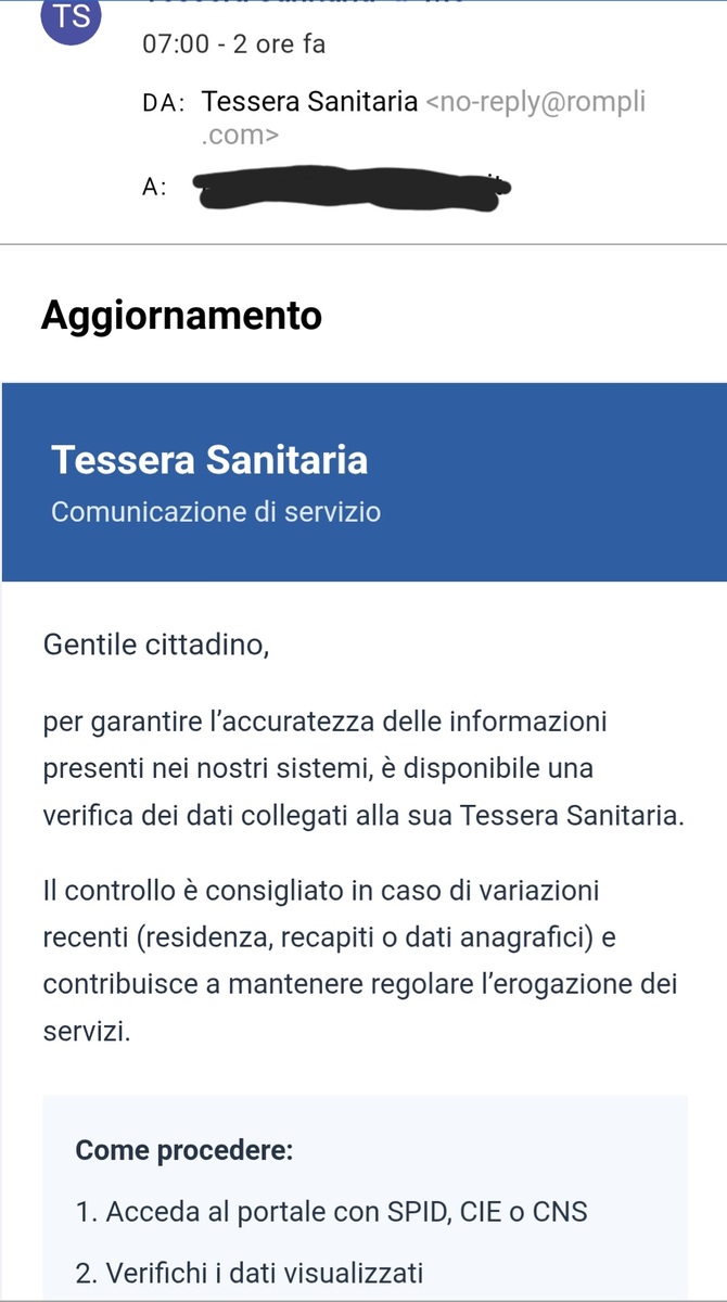Un lettore ci ha scritto per evidenziare di essere stato vittima di un tentativo di truffa via mail, con la richiesta di verifica dei dati della tessera sanitaria.