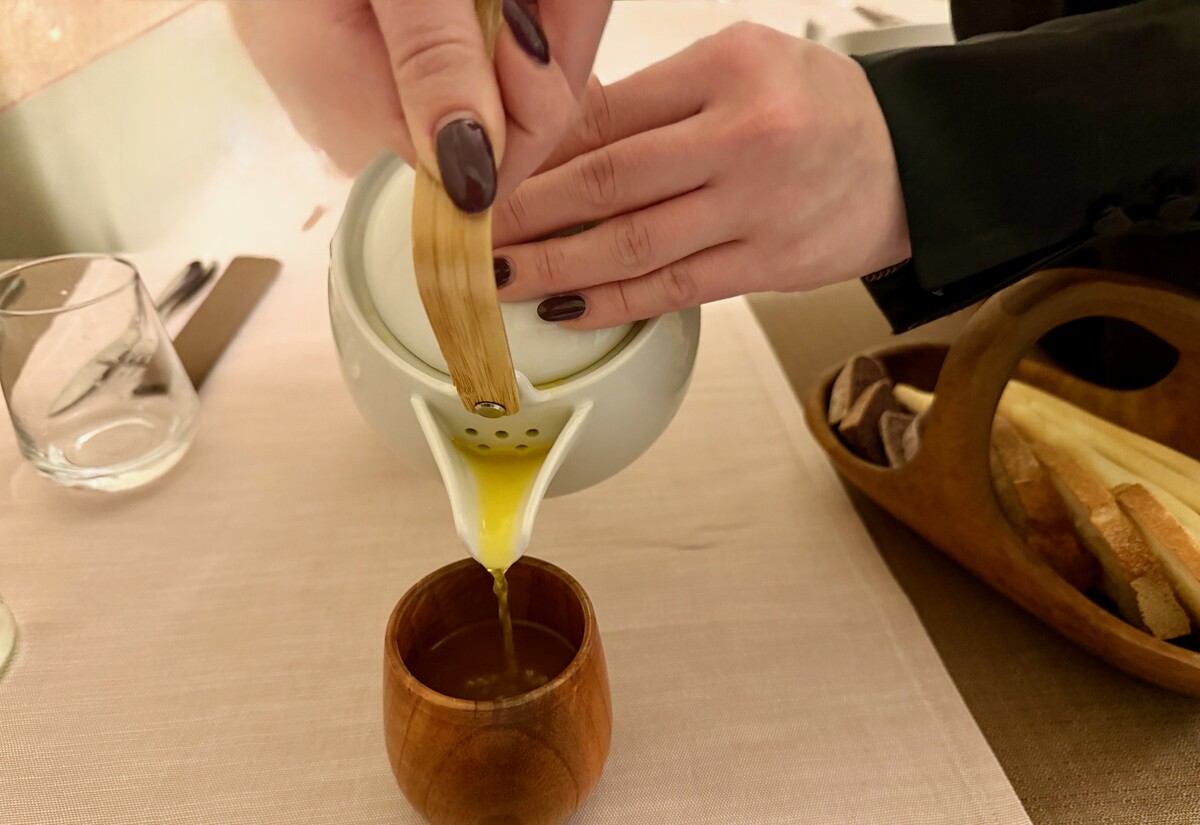 Il viaggio inizia con note promettenti. Decisamente originale, oltreché piacevole in una sera d’inverno, proporre come amouse-bouche un Consommé di brodo di verdure, zafferano e finocchietto di montagna servito in un bicchiere di legno.