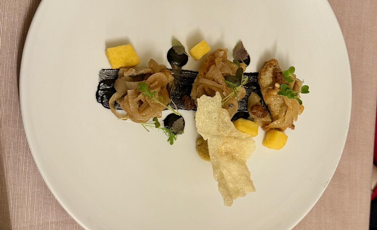 Continuo con un equilibrato Saör di pesce e verdure con polentina fritta, nel quale il sapore di baccalà, triglia e sarda emerge in modo preciso, valorizzato da un agrodolce ben giocato.