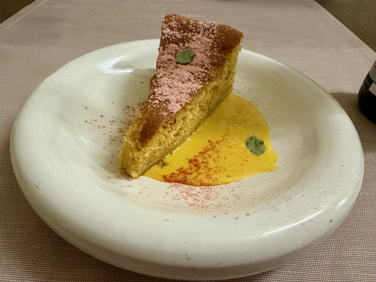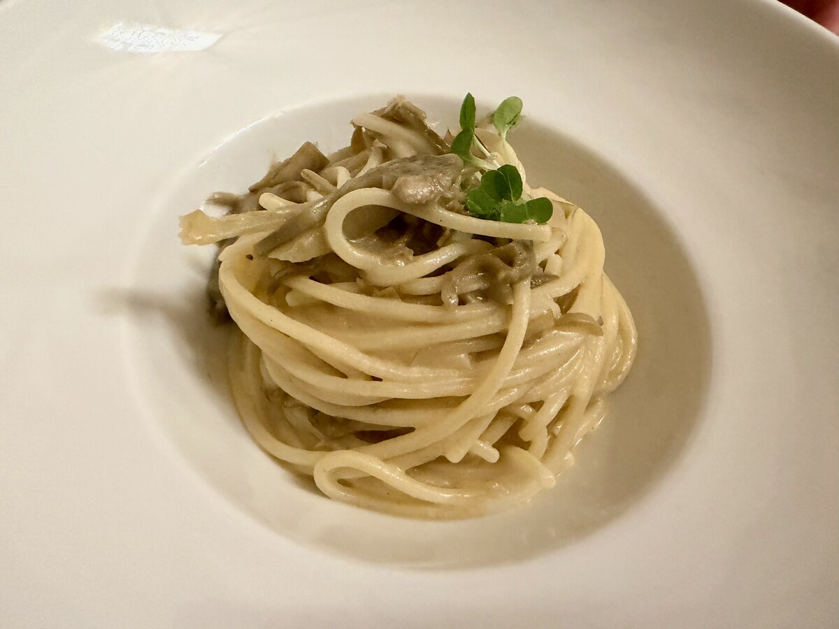 Purtroppo in forte controtendenza rispetto ai piatti precedenti lo Spaghettone alla chitarra con carciofi, pecorino romano e crema di baccala: qui a non funzionare non è la pasta, perfettamente cotta, ma l’amalgama degli ingredienti che impedisce a ciascuno di essi di venire valorizzato come dovrebbe.