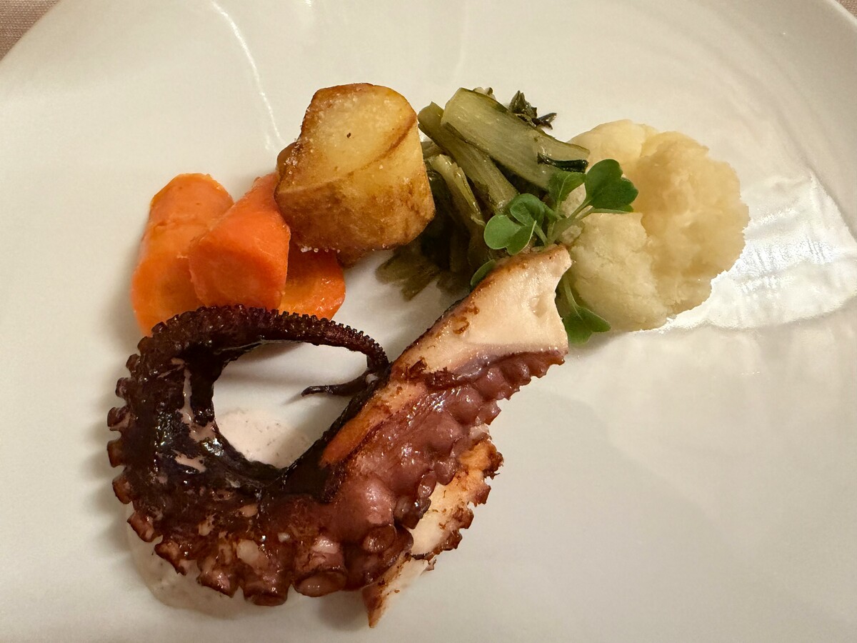 A cancellare la delusione provvede il Pescato del giorno: un Polpo cotto alla perfezione, accompagnato da verdure (patate, carote, catalogna e cavolfiore) i cui sapori – questa volta sì! – emergono netti e senza entrare in contrasto tra loro.