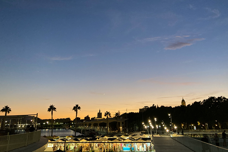 La spiaggia di Málaga è quotidianità: sabbia dorata, mare piatto, famiglie e nessuna estetica turistica. È uno spazio che va solo vissuto. Arriva la sera. Le luci scaldano le facciate, i passi si fanno più lenti, le ombre diventano morbide. La cattedrale emerge come una presenza luminosa, da osservare più che da vivere questa volta. Nelle strade il rumore cambia ritmo, la festa disorganizzata diventa protagonista. Nessuna regia, solo flusso urbano in continuo movimento. Málaga non prepara la notte. La lascia succedere, come tutto il resto. Quello che resta, alla fine del viaggio, non è un’immagine precisa da portare a casa. È una somma di piccole istantanee: un panino mangiato in piedi, un negozio con un’insegna fatta a mano, una strada imboccata senza motivo, il mare che compare all’improvviso tra due palazzi. Málaga non si impone, ma si deposita negli occhi e nel cuore.