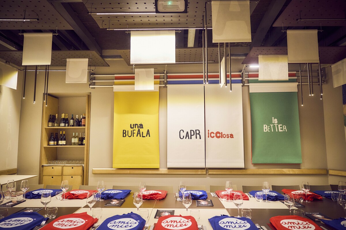 A dare corpo al nuovo Amici Miei sono stati Stefano Cerruti e Marco Rubiola. Il primo, che ha ridisegnato gli interni con misura, lasciando che lo spazio accolga il cambiamento senza esserne travolto. Il secondo, capace di costruire la scenografia del luogo giocando su un immaginario visivo e narrativo ironico, spiazzante, volutamente insolito. Insieme firmano un locale che intende non cristallizzarsi, ma piuttosto evolvere col tempo, mantenendo sempre al centro la pizza, con tutto il resto a farle da sfondo.