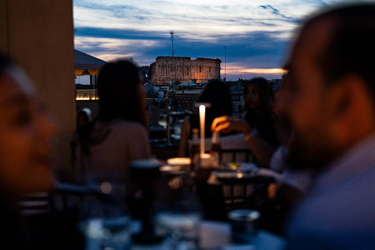 Il locale è frequentato dagli ospiti dell’hotel, ma ha saputo costruire nel tempo una solida clientela esterna, attirata da una proposta gastronomica trasversale e da serate a tema ben costruite, capaci di dare contenuto all’esperienza panoramica. La cucina prova a tenere insieme mediterraneità, grandi classici romani e tocchi più contemporanei, con un equilibrio che risulta leggibile e accessibile.