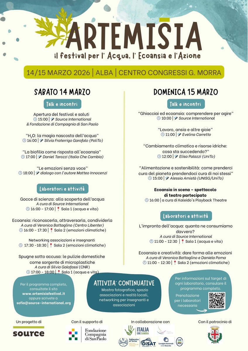 ARTEMISIA nasce come evento conclusivo del progetto  “Keep Calm and Save Water: azioni per ridurre l’impatto idrico e l’eco-ansia”, un percorso promosso da Source International con il sostegno della Fondazione Compagnia di San Paolo, per supportare insegnanti e cittadini delle Langhe. Negli ultimi anni questo territorio – cuore agricolo del Piemonte – è stato duramente colpito da eventi climatici estremi, tra cui la siccità record del 2022. Attraverso formazioni per insegnanti e questo festival aperto alla cittadinanza, il progetto si propone di equipaggiare la comunità locale con conoscenze e competenze per agire in modo consapevole, rafforzando al contempo la rete territoriale di scuole, associazioni e realtà virtuose.