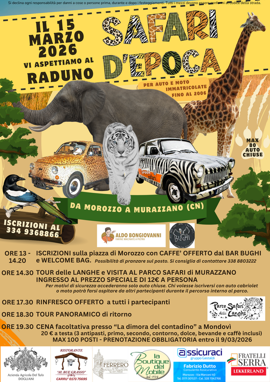 Alle 14.30 partirà il corteo, che attraverserà le suggestive colline delle Langhe per raggiungere il Parco Safari di Murazzano. Qui i partecipanti potranno vivere l’emozione unica di sfilare a bordo della propria auto storica tra leoni, lupi, bisonti, tigri e altri animali. Il biglietto d’ingresso è riservato ai partecipanti al prezzo speciale di 12 euro a persona.