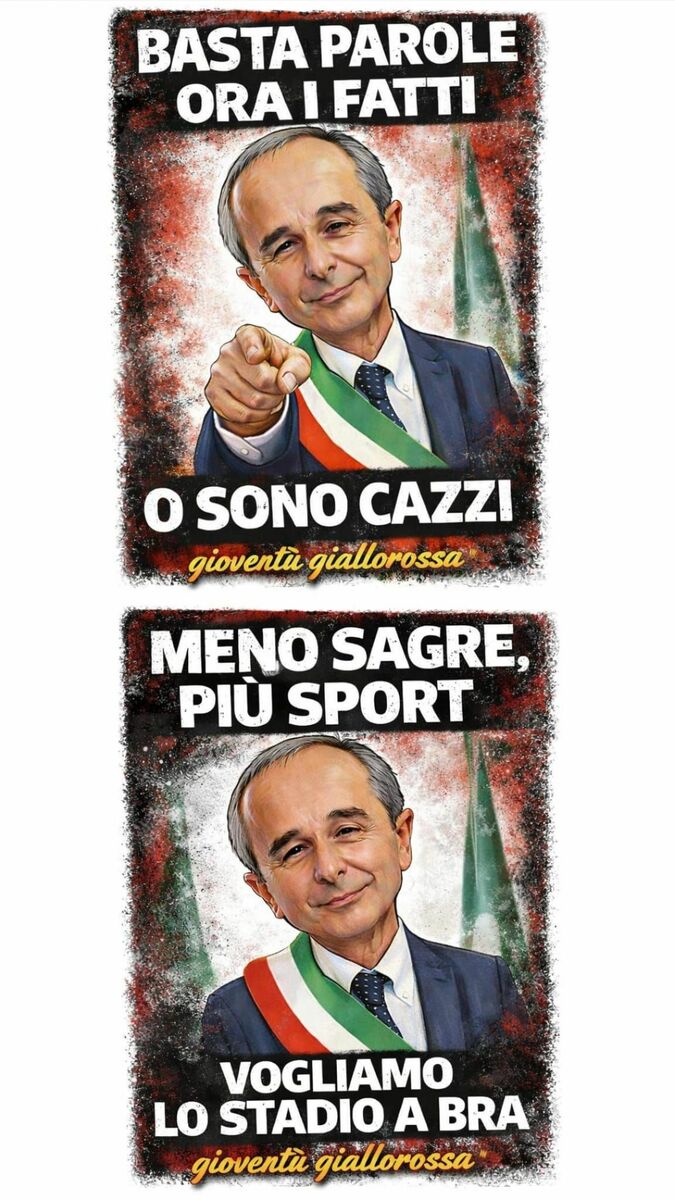 Non nasconde l’amarezza, il sindaco di Bra Gianni Fogliato, destinatario dei manifesti affissi nel centro storico cittadino nella notte tra martedì e mercoledì. Messaggi nei quali, sopra la firma "Gioventù Giallorossa", si chiama in causa il primo cittadino per la ben nota vicenda del "Bravi" da adeguare ai requisiti della Serie C utilizzando però toni che vanno da un più accettabile "Vogliamo lo stadio a Bra" a meno garbate invettive ("Basta parole, ora i fatti o sono cazzi"). Proposizioni dai toni anche minacciosi, quindi, in merito alle quali il sindaco ha sporto denuncia alla Polizia Municipale così che sia questa ad appurare l’esistenza di eventuali fattispecie di reato, risalendo agli autori delle affissioni anche grazie alle telecamere presenti nel centro storico.