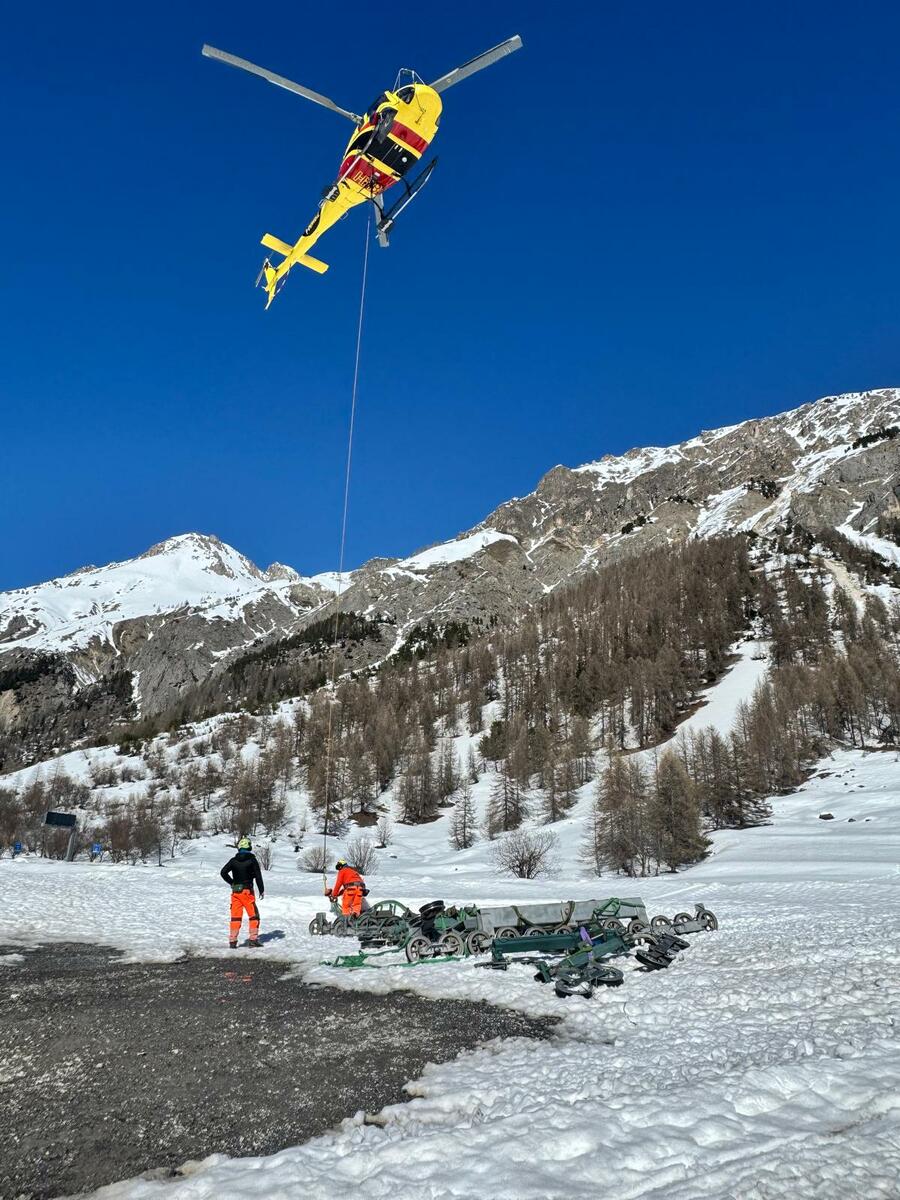 Alle operazioni dei lavori propedeutici hanno contribuito la ditta Tre Alpi, che ha preparato tutte le rulliere dei pali, per ottimizzare i tempi d’intervento dell’elicottero, e la Heli mont Blanc, ditta di elicotteri.