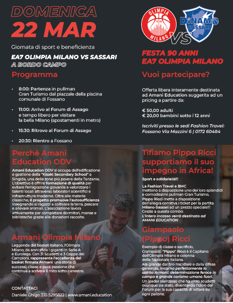 Domenica 22 marzo 2026 si preannuncia come una giornata speciale, di quelle che uniscono sport di altissimo livello, passione collettiva e un gesto concreto di solidarietà. Fashion Travel e BMC, in collaborazione con Giampaolo “Pippo” Ricci, capitano simbolo dell’EA7 Emporio Armani Olimpia Milano, hanno organizzato un evento unico per celebrare i 90 anni della storica società milanese e, soprattutto, per sostenere con forza il progetto Amani Education ODV.
