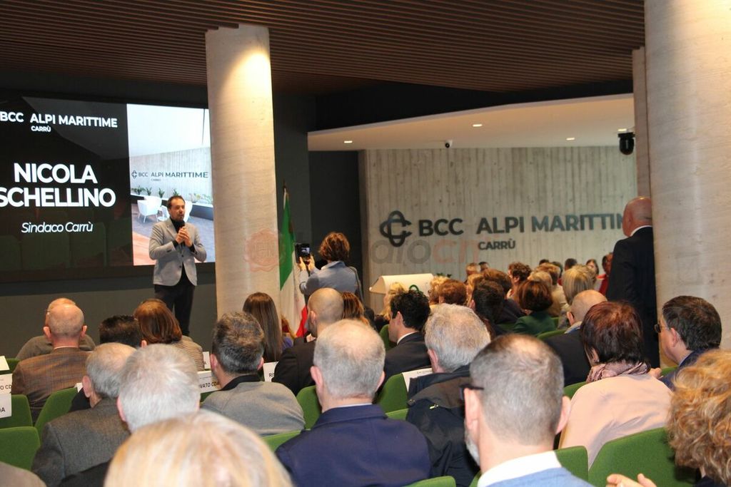 A portare il saluto dell'amministrazione il sindaco, Nicola Schellino che ha ricordato il periodo in cui ebbe occasione di fare lo stage proprio lì: "Ringrazio di cuore la BCC Alpi Marittime per aver restituito questo spazio a nuova vita e soprattutto per aver pensato di metterlo a disposizione dei carrucesi, così come è stato fatto in passato con l'acquisto e il recupero del castello, un'eccellenza che è diventata sede della banca grazie a Rino Filippi, che ha dato modo al nostro paese di non perdere un patrimonio storico e artistico così importante".