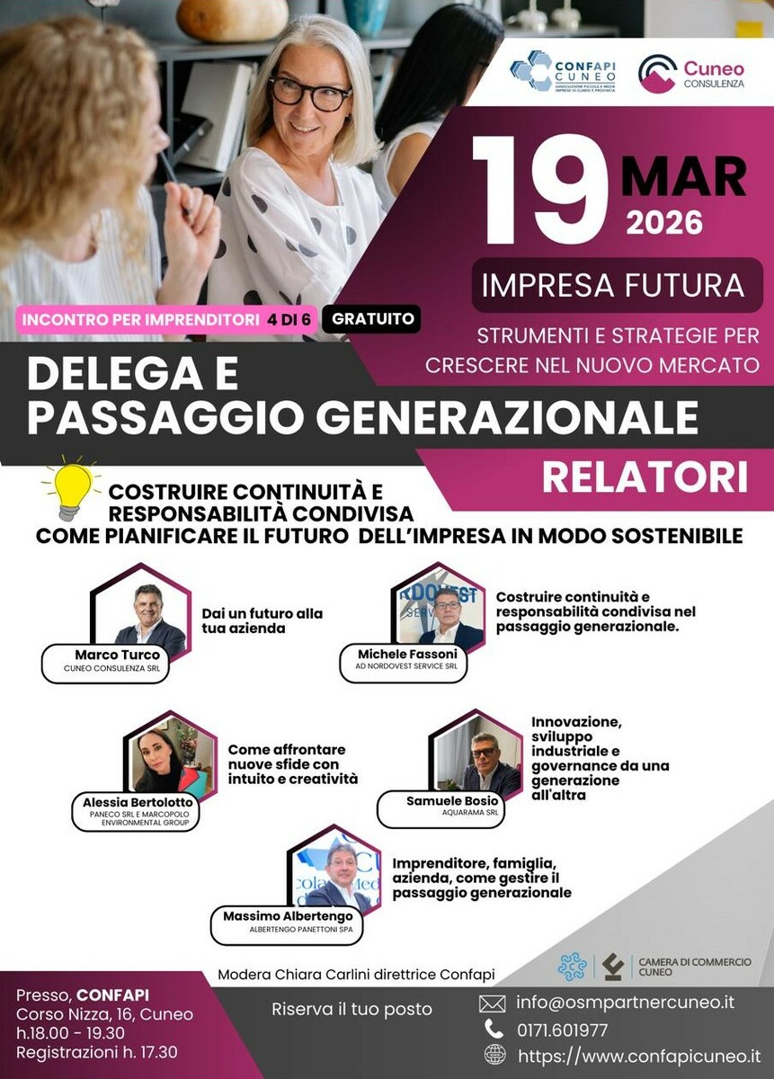 L’incontro si terrà presso Confapi Cuneo, in Corso Nizza 16 a Cuneo, dalle 18.00 alle 19.30, con registrazione partecipanti a partire dalle 17.30. Si tratta del quarto appuntamento su sei del percorso ed è a partecipazione gratuita.