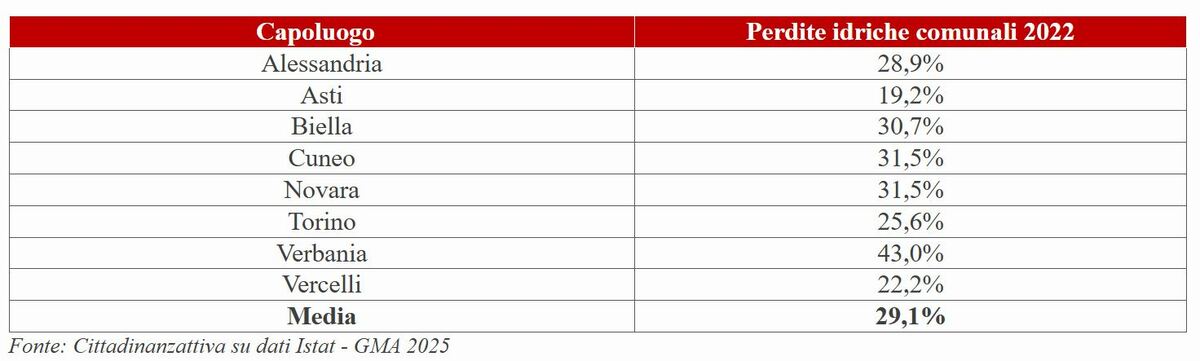 Sul fronte della dispersione idrica, Cuneo si posiziona tra le situazioni più critiche della regione: secondo gli ultimi dati Istat disponibili, relativi al 2022, le perdite idriche nel capoluogo raggiungono il 31,5%, in linea con Novara ma al di sopra della media piemontese del 29,1%. Il dato più preoccupante a livello regionale riguarda Verbania, dove la dispersione tocca il 43%, mentre la situazione migliore si registra ad Asti con il 19,2%. La media piemontese, pur inferiore a quella nazionale del 42,4%, lascia comunque aperta la questione di una rete idrica che disperde quasi un terzo dell'acqua immessa.