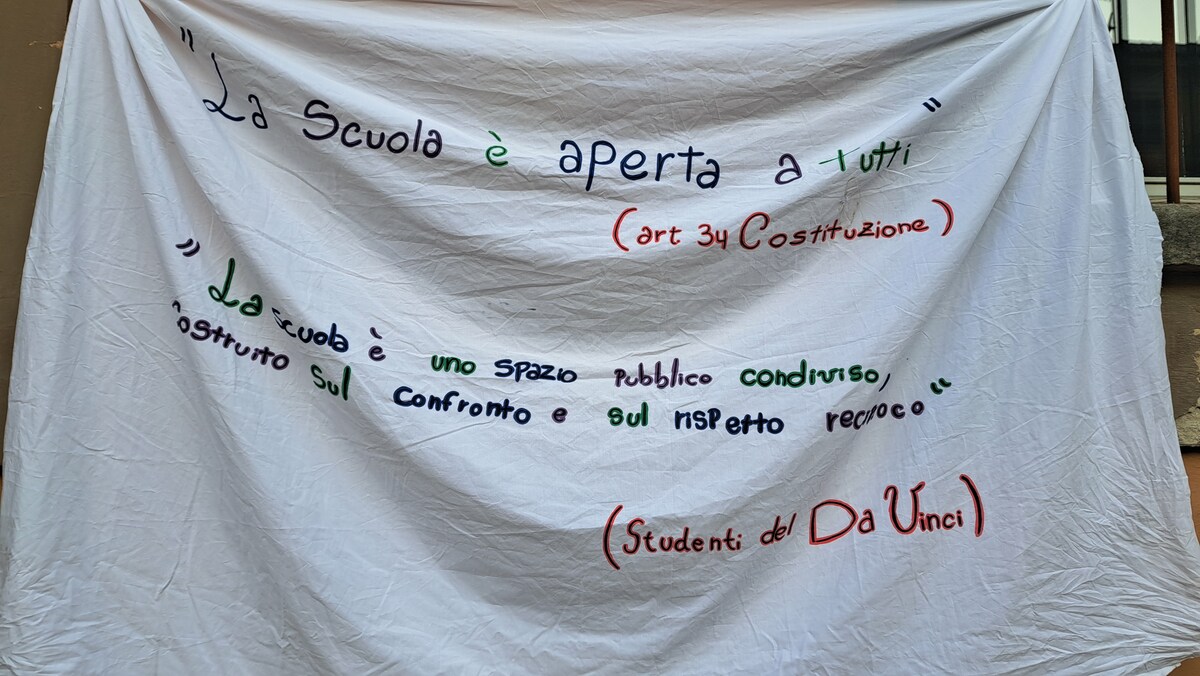 Il telo richiama esplicitamente l’articolo 34 della Costituzione con la frase “La scuola è aperta a tutti” e si completa con una seconda affermazione che ne chiarisce il significato: “La scuola è uno spazio pubblico condiviso costruito sul confronto e sul rispetto reciproco”.