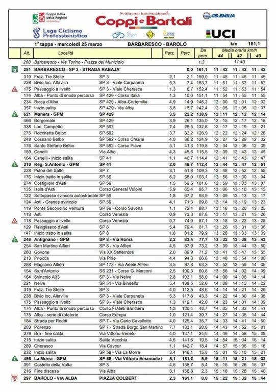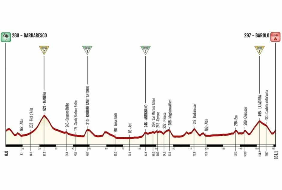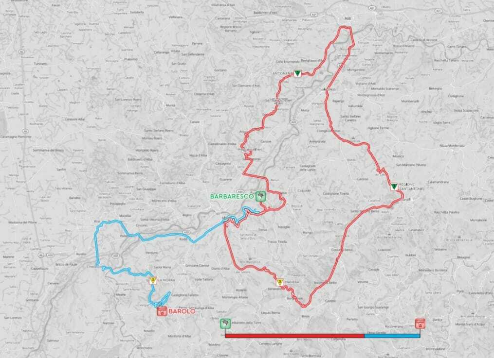 Dopo la partenza dal centro di Barbaresco, alle 11:40 in Piazza del Municipio, i corridori affronteranno numerose asperità, fino ad arrivare sulla linea del traguardo di Piazza Colbert a Barolo (arrivo previsto tra le 15:20 e le 15:50 a seconda della media oraria). Saranno ben quattro i Gran Premi della Montagna: si inizierà con la salita di Manera (4,3 km al 6.2 %), in seguito toccherà al GPM di Regione Sant’Antonio (2 km al 6.8 %), si passerà poi per Antignano (2,7 km al 3.9 %) e infine si salirà verso La Morra (6,5 km al 4.6 %). Proprio quest’ultima asperità potrebbe essere decisiva, essendo posizionata a soli 9900 metri dall’arrivo.