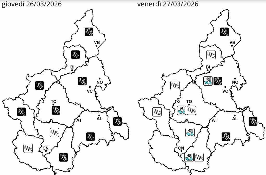 A Villanova Solaro la stazione ha registrato una raffica massima di 64,1 km/h a mezzanotte, mentre questa mattina il vento si mantiene a 25,2 km/h con raffiche fino a 51,5 km/h. Valori simili a Fossano con 29,2 km/h e raffiche fino a 50 km/h, e a Bra con 25,2 km/h e punte di 49,3 km/h.