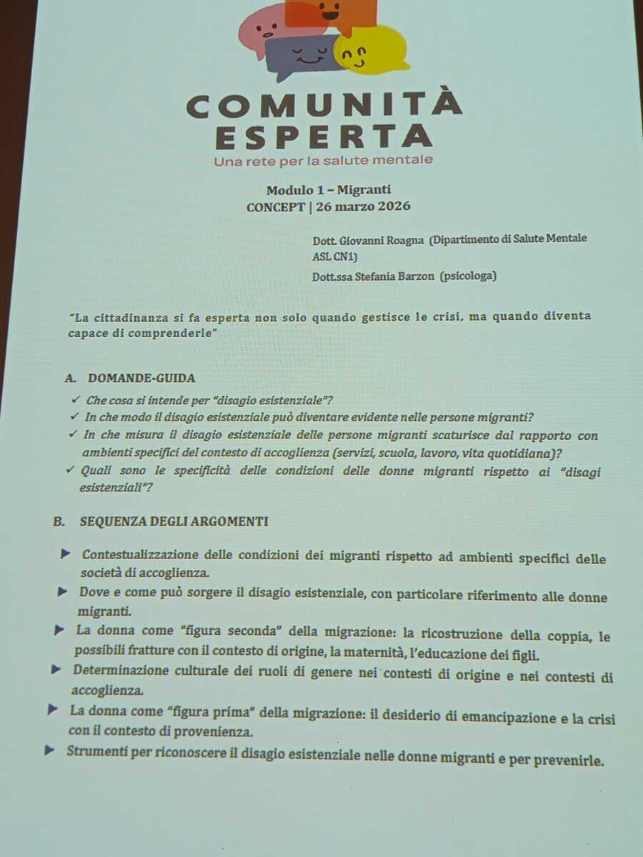 "Creare la comunità esperta: una rete per la salute mentale" è un percorso di formazione finalizzato a promuovere un approccio preventivo e diffuso ai disagi psicologici, realizzato dall'associazione Preziosa, nato nel 2025 con il supporto della Fondazione CRC.