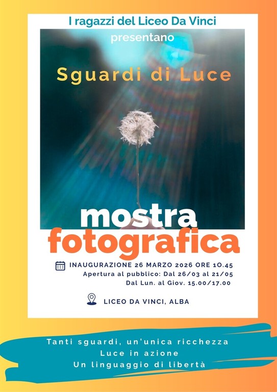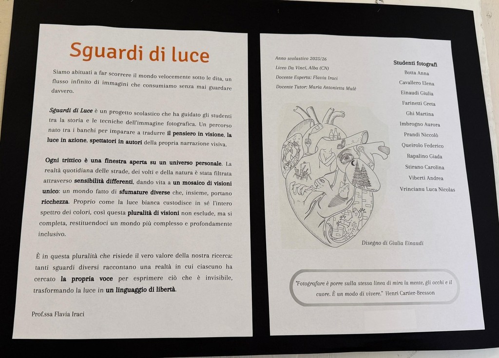 Il Liceo “Leonardo da Vinci” di Alba presenta “Sguardi di luce”, mostra fotografica realizzata dagli studenti nell’ambito di un progetto scolastico che ha trasformato i ragazzi da semplici osservatori in autori consapevoli, capaci di usare l’immagine come linguaggio espressivo e strumento di lettura della realtà. L’inaugurazione è avvenuta questa settimana con un momento di riflessione condivisa sul tema della libertà e della pace, con interventi dei docenti e dei rappresentanti degli studenti, in un appuntamento pensato come occasione di incontro aperta all’intera comunità scolastica.