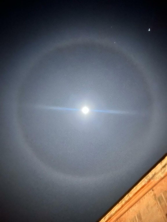 Ieri sera, alzando lo sguardo, era difficile non notare un dettaglio: attorno alla Luna si disegnava un cerchio luminoso, nitido e silenzioso. Un alone perfetto, quasi sospeso, attorno alla luna nella sua fase Gibbosa Crescente, illuminata per oltre la metà.