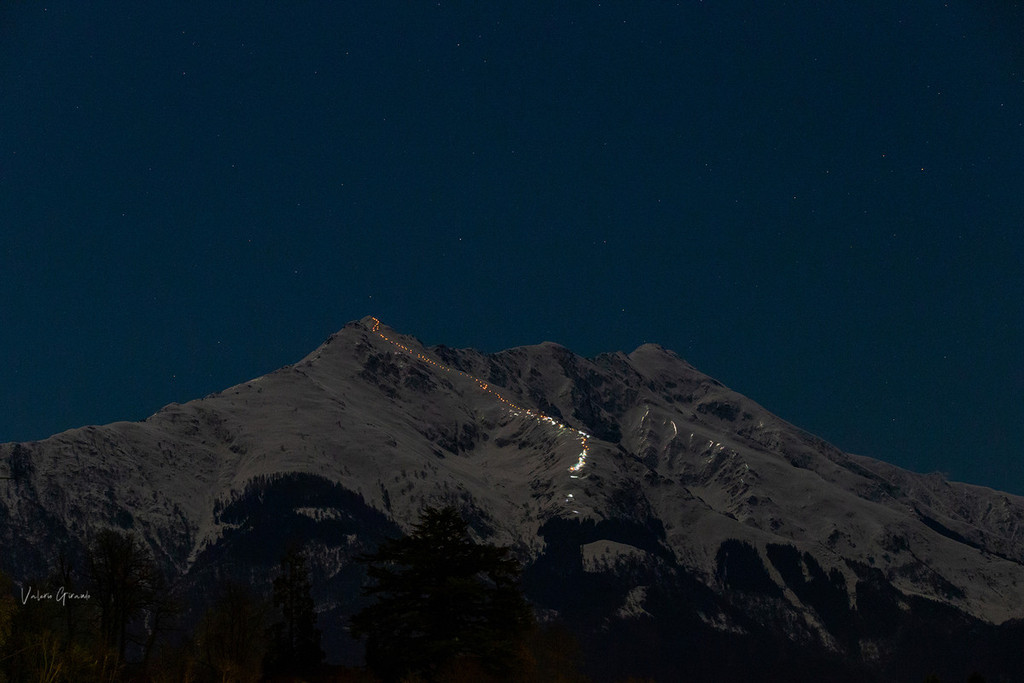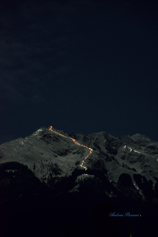 Una volta raggiunta la cima della Bisalta, i partecipanti hanno dato il via alla coreografia con il lancio di alcuni razzi luminosi, che hanno illuminato il cielo notturno. Subito dopo, gli sciatori sono scesi in fila ordinata con le fiaccole accese, disegnando un serpentone luminoso lungo il pendio della montagna.