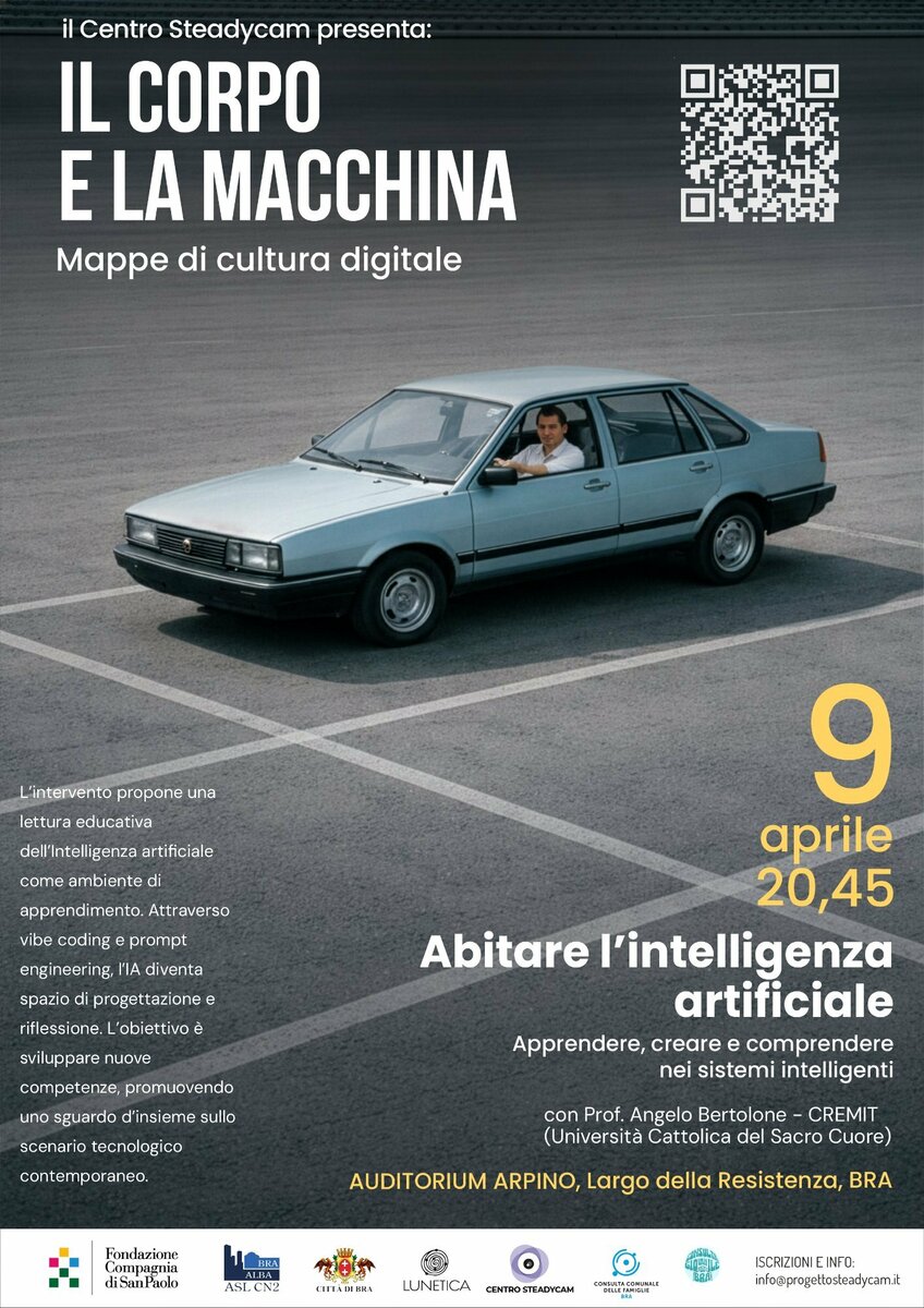Il prossimo appuntamento è il 9 APRILE presso l’AUDITORIUM ARPINO di BRA con la seconda tappa della rassegna: il professor Angelo Bertolone (CREMIT - Università Cattolica di Milano) rifletterà su come “Abitare l’Intelligenza Artificiale”. Bertolone integra la ricerca e l’approfondimento sul tema dell’AI con l’esperienza di insegnamento in un Istituto Superiore, nella quale integra i vari strumenti di Intelligenza artificiale nel lavoro educativo e didattico. Il suo è uno sguardo di attenta esplorazione, che guiderà i partecipanti a conoscere meglio le varie potenzialità dell’AI mantenendo uno sguardo equilibrato sulle loro diverse implicazioni.