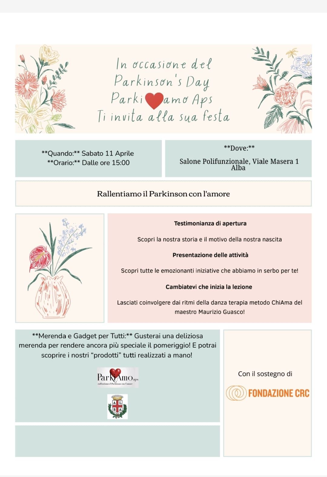 Un pomeriggio per incontrarsi, raccontarsi e farsi conoscere. Sabato 11 aprile, in occasione del Parkinson’s day, l’associazione albese ParkiAmo APS apre le porte alla città con un momento pubblico pensato per condividere attività, esperienze e obiettivi di una realtà nata da un bisogno concreto: non restare soli.