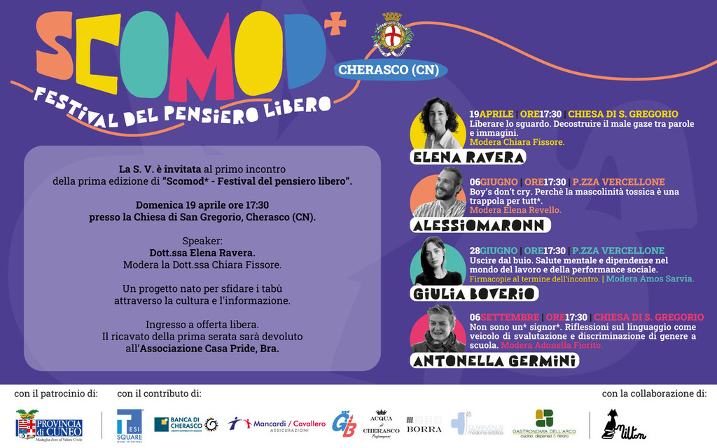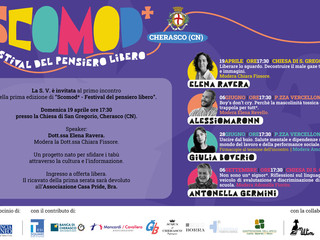 Domenica 19 aprile ci sarà il primo (di quattro appuntamenti) di Scomod* - Festival del pensiero libero: alle ore 17,30 presso la chiesa di S. Gregorio, Elena Ravera con la moderatrice Chiara Fissore tratterà il tema "Liberare lo sguardo. Decostruire il male gaze tra parole e immagini"