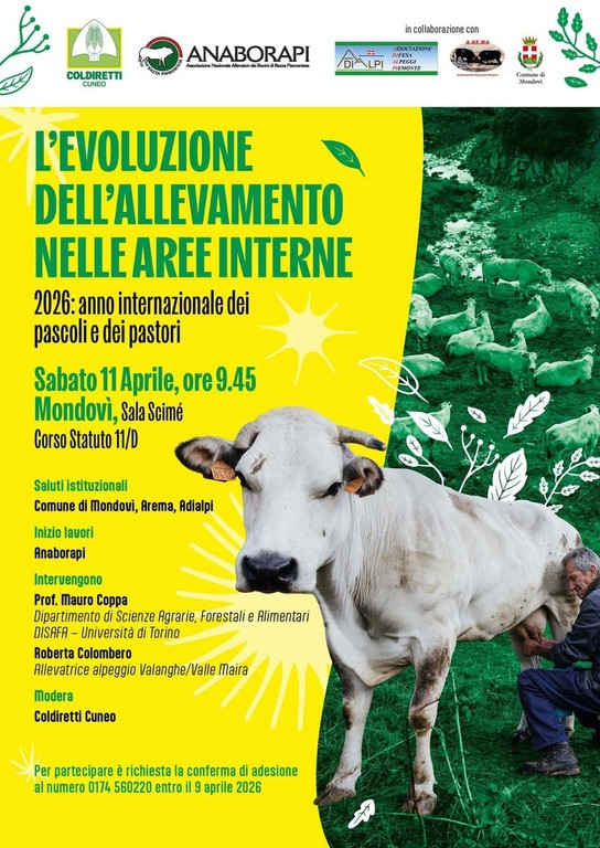Ad aprire gli appuntamenti sarà, sabato 11 aprile alle ore 9.45 presso la Sala Scimé in corso Statuto 11/D, il convegno “L’evoluzione dell’allevamento nelle aree interne”, promosso da Coldiretti Cuneo, Anaborapi e Comune di Mondovì, in collaborazione con Arema e Adialpi, nell’ambito del 2026 proclamato anno internazionale dei pascoli e dei pastori.