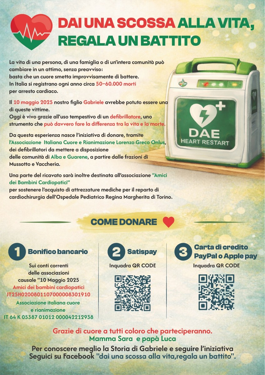 Ci sono storie che non si fermano nel momento più difficile, ma trovano una direzione. Quella di Gabriele, tredici anni, è diventata oggi un progetto concreto per il territorio: portare più defibrillatori negli spazi pubblici tra Alba e Guarene, a partire dalle frazioni Mussotto e Vaccheria.